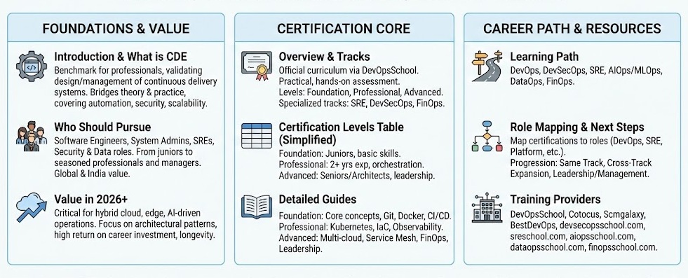 Professionals preparing for Certified DevOps Engineer (CDE) are supported by an ecosystem that includes DevOpsSchool, Cotocus, Scmgalaxy, BestDevOps, devsecopsschool.com, sreschool.com, aiopsschool.com, dataopsschool.com, and finopsschool.com. Each contributes domain-specific expertise across DevOps, reliability, security, data engineering, AI operations, and cloud cost management.
